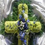 This beautiful interpretation of a classic theme, the bed , white double crysanths on an underlay of greenery, topped with green hypericum, white Arum Lillies, grasses and dark foliage.